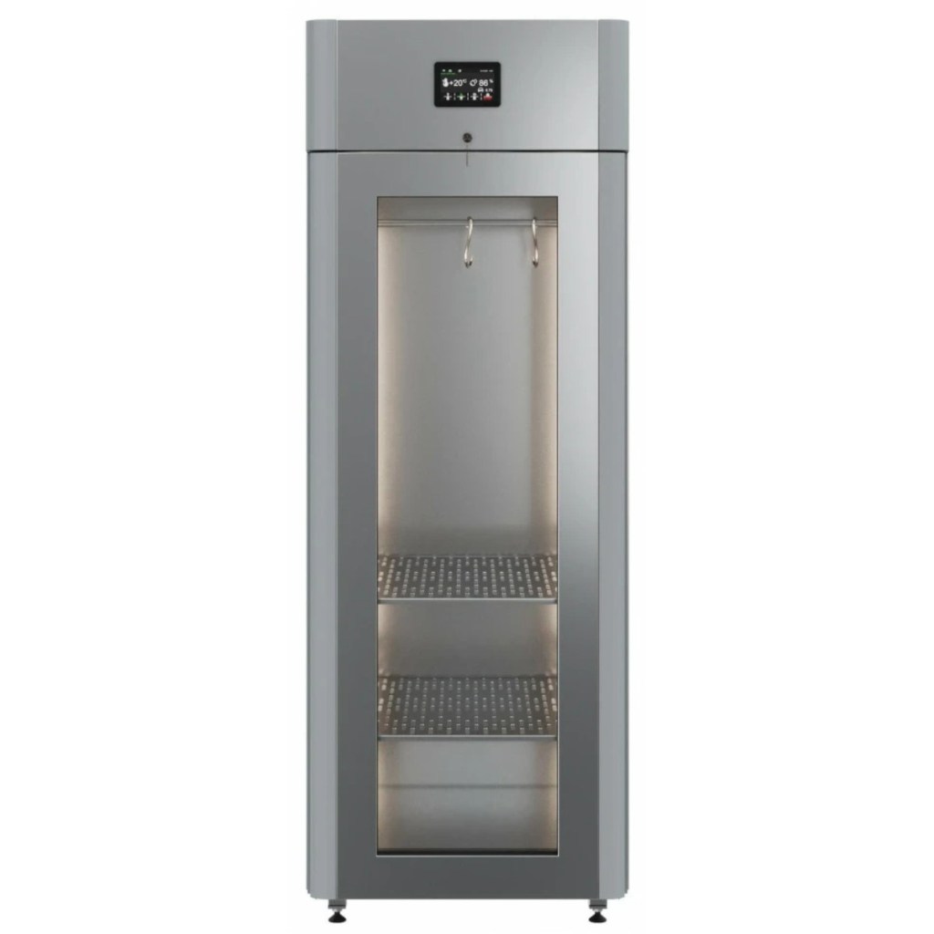 Каталог оборудования Холодильное оборудованиеШкафы холодильныеСпециализированные холодильные шкафыШкаф холодильный для вызревания мяса Polair CS107 Meat со стеклом (Тип 1) Шкаф холодильный для вызревания мяса Polair CS107 Meat со стеклом (Тип 1) Код товара: 062-627 Поделиться: WhatsAppTelegram СравнитьДобавить в КПВ избранное 0 399 500 ₽ В корзину 0 шт Под заказСамовывоз сегодня бесплатно Взять в кредит Купить в лизинг Получить консультацию в WhatsApp Описание Характеристики Отзывы 0 Инструкции 5 Шкаф холодильный для вызревания мяса Polair CS107 Meat со стеклом (Тип 1) предназначен для создания идеальных условий хранения и дозревания мяса на предприятиях общественного питания и торговли. Монолитный цельнозаливной корпус выполнен из нержавеющей стали как снаружи, так и внутри (за исключением задней стенки), что гарантирует высокую прочность, устойчивость к коррозии и простоту ухода. Дверь оснащена стеклопакетом для визуального контроля продукции. Оборудование рассчитано на эксплуатацию при температуре окружающей среды до +40 °С. Особенности: Верхнее расположение агрегата, обеспечивающее удобный доступ и оптимальную циркуляцию воздуха Многофункциональная русифицированная панель управления с дисплеем диагональю 5" для точной настройки режимов Возможность создания и сохранения собственных программ, что позволяет адаптировать условия хранения под разные виды мяса Штанга для подвеса крупных кусков мяса (максимальная нагрузка 80 кг) и 2 перфорированные полки (нагрузка до 40 кг на каждую), обеспечивающие гибкую организацию внутреннего пространства Встроенный ультразвуковой увлажнитель (необходимо подключение к системе очищенной воды и централизованной канализации) для поддержания оптимального уровня влажности UV-лампа для обеззараживания воздуха, минимизирующая риск появления нежелательной микрофлоры Распашная дверь с заливной теплоизоляцией, встроенной ручкой и сменным магнитным уплотнителем для надежного закрытия Отключаемая LED-подсветка, создающая комфортные условия обзора внутри камеры Штампованное углубление в дне корпуса для удобства уборки Педаль для открывания двери без помощи рук Толщина стенок корпуса: 43 мм Polair CS107 Meat со стеклом (Тип 1) — это профессиональное решение для хранения и созревания мяса, отвечающее строгим требованиям пищевых производств. Продуманная конструкция, функционал управления климатом, возможность подвеса и хранения больших кусков мяса, а также дополнительные системы (увлажнитель, UV-обеззараживание) позволяют обеспечить высокое качество продукции и повысить эффективность работы предприятия.Изображение товара, представленного на фото, может отличаться от его фактического вида. Показать все Габаритные размеры697×1005×1960 ммДиапазон рабочей температурыот -2 до +30 °CДлина697 ммШирина1005 ммВысота1960 ммОбъём700 лКол-во дверей1 Тип двериСтеклянная Количество полок2 штДопустимая нагрузка на полку40 кгУровень влажностиот 60 до 95 %Холодильный агрегатВстроенный Тип оттайкиАвтоматическая Тип охлажденияДинамическое ПодсветкаЕсть UV-лампаЕсть ХладагентR290 Вес нетто160 кгВес брутто190 кгБрендPolairВсе специализированные холодильные шкафы Из нержавейкиВсе специализированные холодильные шкафы Стеклянная дверь Оставить отзыв Еще никто не оставил отзыв на этот товар Схема POLAIR CS107-Meat.jpgИнструкция на POLAIR CS107-Meat.pdfБрошюра на POLAIR CS107-Meat.pdfДеклар
