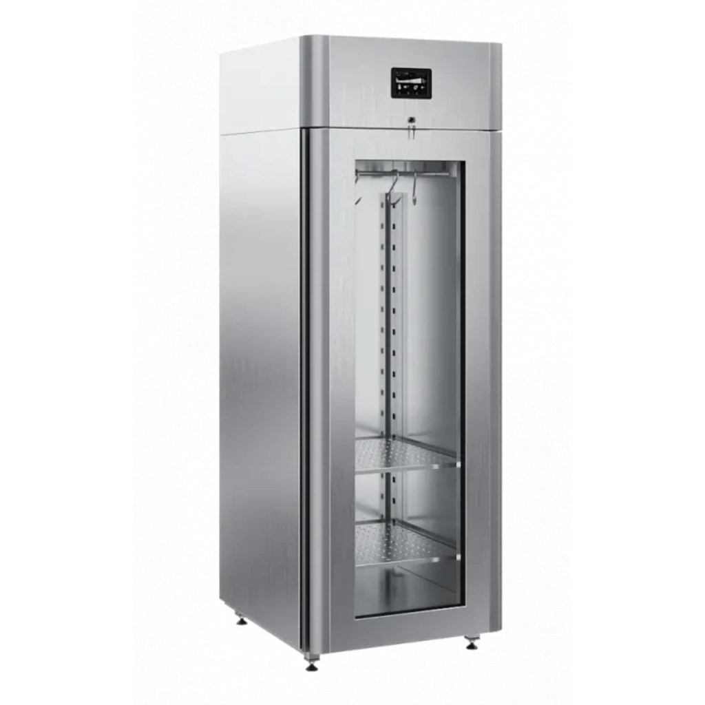 Каталог оборудования Холодильное оборудованиеШкафы холодильныеСпециализированные холодильные шкафыШкаф холодильный для вызревания мяса Polair CS107 Meat со стеклом (Тип 2) Шкаф холодильный для вызревания мяса Polair CS107 Meat со стеклом (Тип 2) Код товара: 062-629 Поделиться: WhatsAppTelegram СравнитьДобавить в КПВ избранное 0 402 050 ₽ В корзину 0 шт Под заказСамовывоз сегодня бесплатно Взять в кредит Купить в лизинг Получить консультацию в WhatsApp Описание Характеристики Отзывы 0 Инструкции 5 Шкаф холодильный для вызревания мяса Polair CS107 Meat со стеклом (Тип 2) для обеспечения оптимальных условий хранения и дозревания мяса на предприятиях общественного питания и торговли. Монолитный цельнозаливной корпус выполнен из нержавеющей стали снаружи и внутри (за исключением задней стенки), что гарантирует высокую механическую прочность, устойчивость к коррозии и гигиеничность. Дверь оснащена стеклопакетом для удобного визуального контроля. Оборудование рассчитано на работу при температуре окружающей среды до +40 °С. Особенности: Верхнее расположение агрегата, обеспечивающее эффективное распределение холода и легкий доступ к обслуживанию Многофункциональная русифицированная панель управления с цветным дисплеем диагональю 5", позволяющая точно настраивать режимы и контролировать все параметры работы Возможность создания и сохранения индивидуальных программ, что обеспечивает гибкость при работе с разными видами мяса 4 перфорированные полки из нержавеющей стали, каждая с максимальной нагрузкой до 40 кг, для удобного размещения продукции Встроенный ультразвуковой увлажнитель (требуется подключение к системе подачи очищенной воды и к централизованной канализации) для поддержания стабильного уровня влажности и предотвращения пересыхания продукта UV-лампа для обеззараживания воздуха, которая снижает риск размножения патогенной микрофлоры и обеспечивает безопасность хранения Распашная дверь с заливной теплоизоляцией, встроенной ручкой и сменным магнитным уплотнителем, обеспечивающим плотное закрытие Отключаемая LED-подсветка, которая делает внутреннее пространство хорошо освещённым и удобным для работы Штампованное углубление в дне корпуса для упрощения уборки и отвода конденсата Педаль для открытия двери без помощи рук, повышающая гигиеничность и удобство Толщина стенок корпуса: 43 мм Polair CS107 Meat со стеклом (Тип 2) — это профессиональное решение для хранения и созревания мяса, которое сочетает продуманную конструкцию и современные технологии. Четкая система управления, продвинутый контроль климата, качественные материалы и высокая функциональность позволяют гарантировать идеальные условия для продукции, способствуя повышению качества и рентабельности работы предприятия.Изображение товара, представленного на фото, может отличаться от его фактического вида. Показать все Габаритные размеры697×1005×1960 ммДиапазон рабочей температурыот -2 до +30 °CДлина697 ммШирина1005 ммВысота1960 ммОбъём700 лКол-во дверей1 Тип двериСтеклянная Количество полок4 штДопустимая нагрузка на полку40 кгУровень влажностиот 60 до 95 %Холодильный агрегатВстроенный Тип оттайкиАвтоматическая Тип охлажденияДинамическое ПодсветкаЕсть UV-лампаЕсть ХладагентR290 Вес нетто160 кгВес брутто190 кгБрендPolairВсе специализированные холодильные шкафы Из нержавейкиВсе специализированные холод