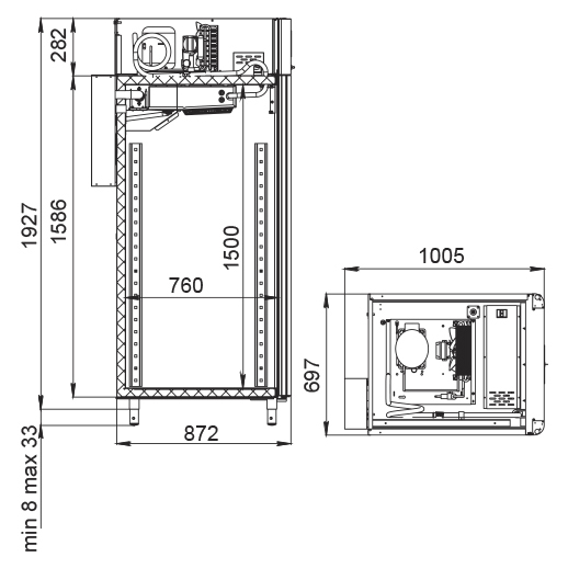 Каталог оборудования Холодильное оборудованиеШкафы холодильныеСпециализированные холодильные шкафыШкаф холодильный для вызревания салями Polair CS107 Salami со стеклом Шкаф холодильный для вызревания салями Polair CS107 Salami со стеклом Код товара: 062-631 Поделиться: WhatsAppTelegram СравнитьДобавить в КПВ избранное 0 385 050 ₽ В корзину 0 шт Под заказСамовывоз сегодня бесплатно Взять в кредит Купить в лизинг Получить консультацию в WhatsApp Описание Характеристики Отзывы 0 Инструкции 5 Шкаф холодильный для вызревания салями Polair CS107 Salami со стеклом предназначен для приготовления и хранения салями, сыровяленых колбас и других мясных деликатесов на предприятиях общественного питания и торговли. Корпус цельнозаливной конструкции выполнен из нержавеющей стали снаружи и внутри (кроме задней стенки), что обеспечивает высокую прочность и долговечность. Дверь выполнена в виде стеклопакета для удобного визуального контроля. Оборудование рассчитано на работу при температуре окружающей среды до +40 °С. Особенности: Динамическое охлаждение с мягким обдувом без заветривания Верхнее расположение агрегата Автоматическая оттайка с системой испарения конденсата Русифицированная многофункциональная панель управления с дисплеем 5" и возможностью создания и сохранения собственных программ Встроенный ультразвуковой увлажнитель (необходима подача очищенной воды и подключение к канализации) UV-лампа для обеззараживания воздуха внутри камеры 3 пары направляющих с тремя перекладинами и подвесами для колбас Регулируемый уровень влажности: от 60 до 95 % Распашная дверь с заливной теплоизоляцией, встроенной ручкой и магнитным уплотнителем Отключаемая внутренняя LED-подсветка Штампованное углубление в дне корпуса для удобства ухода Педаль для удобного открытия двери Хладагент R290 (пропан) Толщина стенки корпуса: 43 мм Polair CS107 Salami со стеклом — это профессиональный шкаф, разработанный специально для мясных деликатесов. Он обеспечивает оптимальные условия для ферментации и хранения продукции за счёт точного контроля температуры и влажности, продуманной конструкции и удобного функционала. Такой шкаф станет надёжным решением для мясных цехов, гастробаров и специализированных магазинов.Изображение товара, представленного на фото, может отличаться от его фактического вида. Показать все Габаритные размеры697×1005×1960 ммДиапазон рабочей температурыот -2 до +30 °CДлина697 ммШирина1005 ммВысота1960 ммОбъём700 лКол-во дверей1 Тип двериСтеклянная Уровень влажностиот 60 до 95 %Холодильный агрегатВстроенный Тип оттайкиАвтоматическая Тип охлажденияДинамическое ПодсветкаЕсть UV-лампаЕсть ХладагентR290 Вес нетто160 кгВес брутто190 кгБрендPolairВсе специализированные холодильные шкафы Из нержавейкиВсе специализированные холодильные шкафы Стеклянная дверь Оставить отзыв Еще никто не оставил отзыв на этот товар Схема POLAIR CS107 Salami.jpgИнструкция на POLAIR CS107 Salami.pdfБрошюра на POLAIR CS107 Salami.pdfДекларация о соответствии.pdfСертификат соответствия.pdf Похожие товары Перейти в каталог Под заказ 397 800 ₽ Шкаф холодильный для вызревания сыра Polair CS107 Cheese полки нерж., со стеклом Под заказ 373 915 ₽ Шкаф холодильный для вызревания салями Polair CS107 Salami черный, со стеклом Под заказ 389 300 ₽ Шкаф холодильный для вызревания мяса Polair CS107 Meat (Тип 1) Под заказ 399 500 ₽ Шкаф холодильный для вызревания мяса Polair CS107 Meat со стеклом (Тип 1) Под за