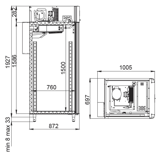Каталог оборудования Холодильное оборудованиеШкафы холодильныеСпециализированные холодильные шкафыШкаф холодильный для вызревания сыра Polair CS107 Cheese полки нерж. Шкаф холодильный для вызревания сыра Polair CS107 Cheese полки нерж. Код товара: 062-628 Поделиться: WhatsAppTelegram СравнитьДобавить в КПВ избранное 0 391 000 ₽ В корзину 0 шт Под заказСамовывоз сегодня бесплатно Взять в кредит Купить в лизинг Получить консультацию в WhatsApp Описание Характеристики Отзывы 0 Инструкции 5 Шкаф холодильный для вызревания сыра Polair CS107 Cheese полки нерж. предназначен для создания оптимальных условий хранения и дозревания твердых и полутвердых сыров на предприятиях общественного питания и торговли. Монолитный цельнозаливной корпус выполнен из нержавеющей стали снаружи и изнутри (кроме задней стенки), что обеспечивает высокую механическую прочность и долговечность шкафа. Оборудование рассчитано на работу при температуре окружающей среды до 40 °С. Особенности: Верхнее расположение агрегата Многофункциональная русифицированная контрольная панель с 5-дюймовым дисплеем Возможность создания и сохранения собственных программ в памяти электронного блока Четыре перфорированные полки из нержавеющей стали Встроенный ультразвуковой увлажнитель (требуется подключение к системе подачи очищенной воды и централизованной канализации) Распашная дверь с заливной теплоизоляцией Заменяемый уплотнитель двери с магнитной вставкой Встроенная ручка для удобства открытия Отключаемая внутренняя LED-подсветка Штампованное углубление в дне корпуса для облегчения ухода Надежный замок Педаль для бесконтактного открывания двери Регулировка уровня влажности от 60% до 95% Максимальная нагрузка на каждую полку — 40 кг Толщина стенок корпуса — 43 мм Polair CS107 Cheese полки нерж. — это современный и надежный холодильный шкаф, который обеспечивает идеальные условия для хранения и дозревания твердых и полутвердых сыров. Прочный корпус, точное управление влажностью и температурой, а также удобство эксплуатации делают его отличным решением для предприятий общественного питания и торговли, стремящихся сохранить качество и вкусовые свойства сырной продукции.Изображение товара, представленного на фото, может отличаться от его фактического вида. Показать все Габаритные размеры697×1005×1960 ммДиапазон рабочей температурыот -2 до +30 °CДлина697 ммШирина1005 ммВысота1960 ммОбъём700 лКол-во дверей1 Тип двериМеталлическая Количество полок4 штДопустимая нагрузка на полку40 кгУровень влажностиот 60 до 95 %Холодильный агрегатВстроенный Тип оттайкиАвтоматическая Тип охлажденияДинамическое ПодсветкаЕсть ХладагентR290 Вес нетто144 кгВес брутто171 кгБрендPolairВсе специализированные холодильные шкафы Из нержавейки Оставить отзыв Еще никто не оставил отзыв на этот товар Схема POLAIR CS107 Cheese.jpgИнструкция на POLAIR CS107 Cheese.pdfБрошюра на POLAIR CS107 Cheese.pdfДекларация о соответствии.pdfСертификат соответствия.pdf Похожие товары Перейти в каталог Под заказ 252 314 ₽ Шкаф холодильный для вызревания мяса и сыра Carboma M700GN-1-G-MHC 9005 Под заказ 419 900 ₽ Шкаф холодильный для хлебопекарных производств Polair CS107-Bakery Br со стеклом (Тип 2) Под заказ 402 050 ₽ Шкаф холодильный для вызревания мяса Polair CS107 Meat со стеклом (Тип 2) Под заказ 385 050 ₽ Шкаф холодильный для вызревания салями Polair CS107 Salami со стеклом Под заказ 282 471 ₽ Шкаф холодильный для вызревания мяса и сыра Carboma M70