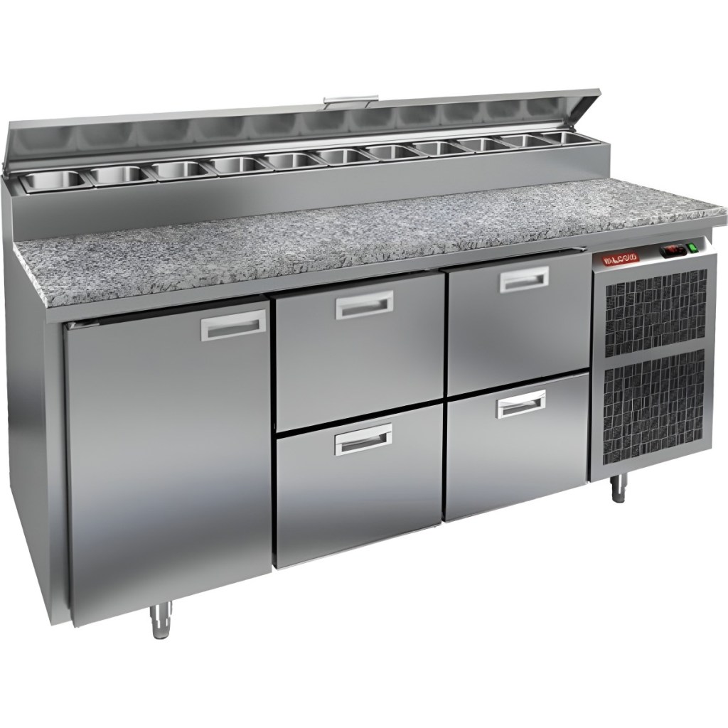 Каталог оборудования Холодильное оборудованиеСтолы охлаждаемыеСтолы холодильные для пиццыСтол холодильный для пиццы HiCold PZ2-122GN (1/6) камень Стол холодильный для пиццы HiCold PZ2-122GN (1/6) камень Код товара: 064-757 Поделиться: WhatsAppTelegram СравнитьДобавить в КПВ избранное 0 308 061 ₽ В корзину 0 шт Под заказСамовывоз сегодня бесплатно Взять в кредит Купить в лизинг Получить консультацию в Max Описание Характеристики Отзывы 0 Стол холодильный для пиццы HiCold PZ2-122GN (1/6) камень предназначен для кухонь и предприятий общественного питания. Он используется для раскатки теста, подготовки ингредиентов для пиццы, салатов и других блюд, а также для охлаждения и кратковременного хранения скоропортящихся продуктов. Модель совмещает гранитную рабочую поверхность и охлаждаемый отсек с 1 дверью и 4 ящиками, обеспечивая удобный доступ к ингредиентам и эффективное хранение. Особенности: Динамическая система охлаждения для равномерного поддержания температуры Автоматическая оттайка для удобного обслуживания Электронная панель управления для точной настройки параметров Вместительная внутренняя полка формата GN 1/1 (размер 530×325 мм) 1 дверь и 4 вместительных ящика для хранения ингредиентов Автоматические доводчики дверей с фиксатором открытого положения Легкозаменяемые магнитные уплотнители для герметичности Открытая агрегатная часть для легкого доступа к компонентам Регулируемые по высоте ножки для устойчивости Гранитная рабочая поверхность глубиной 486 мм и толщиной 50 мм — устойчива к повреждениям, высоким температурам и царапинам Толщина теплоизоляции: 50 мм Максимальная глубина гастроемкостей: 100 мм Вместимость салат-бара: 11 гастроемкости Стол холодильный HiCold PZ2-122GN (1/6) камень — это надёжный и функциональный стол для пиццы. Он сочетает рабочую поверхность и охлаждаемый отсек, облегчает хранение и подготовку ингредиентов, повышает удобство работы повара и соответствует стандартам профессиональной кухни.Изображение товара, представленного на фото, может отличаться от его фактического вида. Показать все Габаритные размеры1835×700×1000 ммДиапазон рабочей температурыот +2 до +10 °CРасположение агрегатаБоковое Материал столешницыГранитная Тип столаС дверьми и ящиками Тип двериГлухая Объём350 лТип гастроемкостейGN 1/6 Количество дверей1 штКоличество ящиков4 штРазмер полки530×325 ммНапряжение220 ВМощность0,5 кВтТип охлажденияДинамическое Тип оттайкиАвтоматическая Габариты в упаковке2000×850×1140 ммВес нетто172 кгВес брутто248 кгБрендHicoldВсе холодильные столы для пиццы Hicold Оставить отзыв Еще никто не оставил отзыв на этот товар Ранее просмотрено Под заказ 119 332 ₽ Стол холодильный среднетемпературный HiCold SNEG 11 HT без столешницы